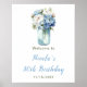 Signe de bienvenue d'anniversaire magnifique avec des fleurs de pivoine bleues dans un pot mason. Parfait pour une fête d'anniversaire. Les mots peuvent être modifiés pour répondre à vos propres détails ou exigences