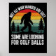 Cette illustration humoristique présente un Bigfoot en silhouette qui traverse un paysage boisé, tenant un club de golf comme à la recherche d'une balle perdue. L'arrière - plan est un coucher de soleil de style rétro avec des rayures horizontales dans les tons chauds de rouge, orange, jaune et vert, évoquant une atmosphère extérieure vintage. Au-dessus du Bigfoot, le texte "PAS TOUS CEUX QUI VEULENT NE SONT PAS PERDUS" tourne en haut, tandis qu'en-dessous, "CERTAINS CHERCHENT DES BALLES DE GOLF" est affiché avec audace. Le design combine habilement une créature mythique et une punchline sur le thème du golf.