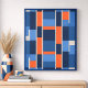 Un design abstrait géométrique moderne composé de rectangles et de carrés adjacents en bleu clair, bleu foncé et orange, séparés par de fines lignes gris clair. La disposition forme des rangées horizontales parallèles avec une répétition équilibrée de couleurs et de formes, créant un aspect visuel rythmé et structuré qui rappelle un mur carrelé ou une mosaïque contemporaine.