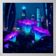 A fusion of radiant neon blooms and a futuristic cityscape, where organic forms glow with fiber-optic light—a visionary cyberpunk art print