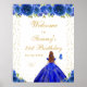 Ce panneau de bienvenue élégant et glamour pour la fête d'anniversaire présente une belle princesse aux cheveux roux bruns et à la peau claire dans une robe de bal bleu royal. Le texte combine écriture manuscrite et polices sans serif modernes pour un look élégant et sophistiqué. Les compositions florales, les papillons et les confettis d'or créent un mélange parfait de rustique et de chic. Graphiques par www.etsy.com/uk/shop/SunflowerDayLove