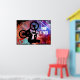 L'action sportive et l'énergie des athlètes BMX sont capturées dans des silhouettes de figures d'action démontrant des tours extrêmes et des cascades sur leurs vélos. Les peintures numériques et les illustrations de ces ados et jeunes hommes comprennent des arrière - plans de couleurs vives et vives, des éclaboussures et des éclats de lumière pour souligner l'action. Ils se produisent aussi dans des scènes de rue grincheuses et pointues où les enfants gagnent leurs cris de rue montrant leurs compétences en vélo.