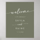 Cette enseigne d'accueil boho chic do-it-yourself vert olive mariage est parfaite pour un mariage minimaliste. La tonalité bohème vert foncé bohème moderne est composée d'une calligraphie rustique simple au style unique mais classique. Personnalisez votre signe de mariage d'accueil imprimable avec les noms du couple et la date. Choisissez soit une affiche d'accueil imprimée, soit un téléchargement instantané imprimable que vous pouvez imprimer localement en tant que projet do-it-yourself.