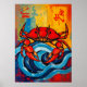 This striking red crab artwork blends bold marine imagery with dynamic, modern design. Set against stylized ocean waves and layered abstract textures, the crab stands strong and centered—its vivid crimson shell contrasting dramatically with deep blues, golden tones, and painterly splashes of color. Subtle calligraphic elements and graphic brushstrokes give the piece an East Asian–inspired aesthetic while keeping the overall feel contemporary and energetic.