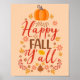 Illustration colorée avec design de texte "Happy fall y'all" et fleurs, citrouille et feuille pour tous ceux qui aiment tomber