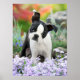 Un mignon chiot féminin Boston Terrier, noir avec des marques blanches, dans un jardin fleuri. Boston Terriers, aussi appelé Boston Bulls ou "American Gentlemen", sont une race de chiens doux, amicaux et intelligents pour la compagnie. Photo de chien aux yeux de chiot prise par Katho Menden, cette affiche est une idée cadeau enchanteresse pour les amoureux de les chiens.