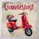 Mignonne affiche avec un tableau blanc d'un cyclomoteur rouge avec un panier de fleurs à l'arrière. Le cyclomoteur présente un design rétro branché. Prêt pour l'aventure. Wanderlust écrit dans une police manuscrite fantaisie. La typographie inspirante. L'arrière - plan est une texture chic et affligée avec des cercles et des marques aléatoires dans une couleur brun clair.