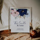 Ce signe de mariage mémorial de bougie nautique moderne est parfait pour un mariage en croisière ou à la plage. Le design fantaisiste présente des fleurs aquarelles rose blush et bleu marine avec des accents d'étoiles de mer dorées, lui donnant une ambiance balnéaire.