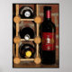 Cette affiche colorée présente une simple vie morte d'une bouteille de vin debout à côté de trois bouteilles supplémentaires dans un porte-vin en bois. Un arrière - plan rustique en brique complète la composition.
