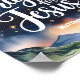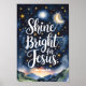 Une aquarelle illustrant un ciel étoilé avec quelques montagnes en arrière - plan. Le ciel est rempli d'étoiles et d'un croissant de lune. Le premier plan contient la phrase "Brille pour Jésus" écrite en cursive. Il y a un orbe lumineux dans le ciel.
