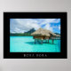 Affiche d'un bungalow en lune de miel au toit de chaume au-dessus de l'eau dans un resort dans la lagune turquoise et limpide de l'île tropicale Bora Bora avec vue sur le mont Otemanu près de Tahiti en Polynésie française avec une frontière noire et le texte : 'Bora Bora'. Superbe décoration sur votre mur !