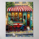 Affiche de grande qualité qui comprend un café en terrasse joyeux avec un auvent rouge et blanc, des fleurs et des chats. Il s'agit d'une pièce idéale pour la cuisine, la salle à manger ou le patio.