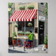 Affiche de grande qualité avec café/café en trottoir avec auvent rouge et blanc, fleurs et chats - une touche d'Americana pour votre salle à manger, cuisine ou patio.