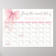 Élégant calendrier "Devinez la date prévue d'accouchement" pour baby shower Coquette Rose à nœud, avec des nœuds roses délicats et des détails élégants. Activité parfaite pour que les invités prédisent l'arrivée du bébé tout en ajoutant une touche personnalisée et élégante à votre décoration de célébration.