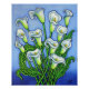 Une peinture stylisée couleur imprimé de beaux lys Calla blancs fait dans une belle palette de couleurs bleu, vert et blanc par Lisa Lorenz