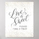 Panneau "L'amour est doux, prenez une friandise", avec calligraphie moderne et fond à paillettes dorées, chic et élégant.