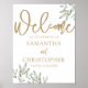 Signalisation de mariage moderne et élégant avec écriture manuscrite en or simple et élégant sur un arrière - plan blanc, avec ajout d'un feuillage vert sage simple et élégant. Customisez avec vos détails uniques.