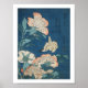 OEuvre d'art vintage du XVIIIe siècle sur un arrière - plan bleu. Canari volant près des tourbières de couleur pêche. Tableau japonais de Kitsushika Hokusai