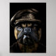 Badass biker carlin portrait de chiot chien. Reflété dans ses yeux est le visage d'un chat chaton effrayé. Le casquette du motard en cuir noir dit "No Katz".