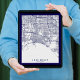 L'élégant imprimé d'art mural présente une carte de la ville moderne pour Long Beach, CA avec des routes teintées bleues et la frontière. Disponible en formats d'impression et de téléchargement numérique.