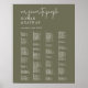 Cette affiche moderne chic vert olive imprimable est parfaite pour un mariage simple. Ce panneau peut être utilisé pour organiser vos invités par ordre alphabétique ou par numéro de table en changeant le nom des en-têtes. Le design boisé boho comprend une typographie bohème rustique unique et élégante dans une couleur verte boisée minimale. Cette enseigne mariage peut accueillir jusqu'à 120 personnes. Faites place à plus (ou moins) de clients en cliquant sur le bouton "personnaliser" et diminuez ou augmentez la taille de la police. En plus du placement de chaque invité, personnalisez ce panneau avec les noms du couple et la date du mariage.