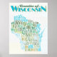 Les 72 beaux comtés du grand état du Wisconsin dépeints dans la typographie fantaisiste. Les dimensions sont de 18 po x 24 po H.