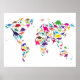 Une carte du monde faite avec des silhouettes de dinosaures multicolores.