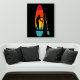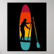 Cette affiche présente l'illustration d'un SUP ou d'une planche à pédales debout et d'une pagaie illustrée en couleurs vibrantes du coucher de soleil avec une illustration en silhouette en noir de quelqu'un qui embarque à la pagaie. Le graphique est défini sur un arrière - plan noir.