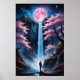 Un paysage nocturne avec une grande lune, une chaîne de montagnes, des cerisiers roses en fleurs, une cascade, et une personne debout à la base de la cascade regardant le ciel rempli d'étoiles et de planètes.