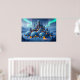 Poster of an impressive castle made of igloos and stone, in a winter landscape of snow and pine trees. Magical aurora lights play in the evenfall sky, bathing the mountains and valley in a surreal atmosphere of heavenly colors. Amidst the misty strands of cold and snow, the stronghold castle known as "Winter Fire" stands. It is the last bastion of civilization and warmth before a vast expanse of frozen tundras, snowcapped mountains, and haunted forests open themselves to the wanderlust of the willing traveler... This artwork was created with ImageFX and upscaled with Leonardo.ai. Additional editing was done offline by me.