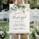 Elégant design botanique caractéristiques "bienvenue à notre cérémonie débranchée" en calligraphie manuscrite et des polices de caractères avec vos noms et message personnalisé en dessous. Montré avec "s'il vous plaît rangez vos téléphones et appareils photo jusqu'après la cérémonie." Orné de bordures de verdure d'aquarelle luxuriante et de fleurs blanches poussiéreuses qui correspondent à notre collection de mariages de verdure Dusty White Roses.