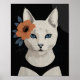 Chat blanc mignon avec yeux bleus et fleur orange en tête d'illustration.