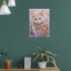 Une affiche avec une belle illustration. Un chat blanc aux cheveux longs qui a l'air royal et élégant. Entouré de fleurs roses, de bijoux en or et en diamant.