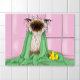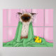 Chat siamois trempant mouillé avec serviette et canard en caoutchouc, très humilié au rire.