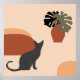 Un chat noir est assis à l'avant de cet abstrait moderne, avec des formes en terre cuite et un vase avec des feuilles derrière.
