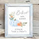 Sympa faveur et traite signe pour votre bébé garçon douche qui comprend "Babies are Sweet, Please Take A Treat" dans un mélange d'un script élégant avec un battement de coeur et une simple typographie grise, et une aquarelle d'un citrouille bleu pastel, florales et verdure.