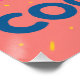 Das Plakat explodiert mit Mustern und Farben. Ein großes Glas stilisierten Cocktails aus Zickzack und Fladen, gepaart mit zufälligen Formen wie Dreiecken, gelben Konfetti, schwarzen Blitzen, in der Mitte auf einem rosafarbenen Boden. Verdrehte Strohhalme kommen aus dem Glas, und Zitronenscheiben werden als Überdruck gezeichnet. Gittermuster, Wellen und Punkte erzeugen ein kontrolliertes Chaos, das typisch für Memphis ist. Das Wort "Cocktails" wird in runden, naiven Buchstaben unten in einer hellblauen Farbe eingetragen.