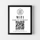 Affiche moderne et simple pour permettre à vos clients ou invités de se connecter facilement à votre réseau wifi. Téléchargez votre logo et votre code QR wifi et ajoutez d'autres détails, tels que le nom et le mot de passe du réseau.
