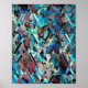 An intricate geometric pattern featuring a mix of triangles and lines. The composition includes a vibrant array of blues, pinks, and blacks.