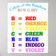 Apprenez l'ordre des couleurs de l'arc-en-ciel. L'acronyme est ROY G BIV. Chaque lettre représente le rouge, l'orange, le jaune, le vert, le bleu, l'indigo et le violet. Chaque nom affiche la couleur. Ce graphique est une aide éducative. La couleur rouge a la longueur d'onde la plus longue et le violet la plus courte.