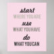 "Commence où tu es. Utilisez ce que vous avez. Faites ce que vous pouvez." citation de motivation affiche rose et gris.