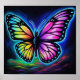 This vibrant poster features a neon butterfly with rainbow-hued, intricate wings and glowing blue aura, set against a dark, cosmic backdrop with soft colorful clouds. Finished in an acrylic oil paint print.