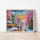 Un tableau d'art moderne et cosy représentant une charmante scène de rue hivernale avec des bâtiments aux couleurs vives, un sapin de Noël joliment décoré, et des gens qui se baladent dans la neige en chute libre. L'utilisation de couleurs pastel vives ajoute une touche chaleureuse et accueillante au froid de l'hiver, créant une atmosphère festive et joyeuse. Cette pièce fantaisiste saisit la magie de la période des fêtes, mêlant nostalgie et style contemporain.