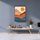 Évoquez la beauté sereine d'un paysage désertique avec cette oeuvre d'art moderne du milieu du siècle. Les formes géologiques Abstraites, en terre cuite chaude, en rouille et en or, s'élèvent sous un soleil éclatant et surdimensionné, tandis que les vagues stylisées de bleu profond et turquoise introduisent un élément surprenant de fluidité et de calme. Des détails linéaires blancs accentuent les contours des montagnes et des vagues, ajoutant une touche sophistiquée et minimaliste. Cet article saisit l'essence d'une soirée tranquille dans le désert, mêlant des tons terreux à une touche rafraîchissante de blues cool, parfaite pour ajouter une touche de calme sophistiqué à tout espace contemporain.