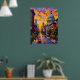 Ce tableau est une représentation vibrante et texturée d'une rue urbaine au coucher du soleil. Le ciel est une toile d'épais coups de pinceau expressifs aux teintes chaudes d'orange, de jaune et de violet, créant un décor dynamique et animé. La scène est un contraste entre l'ancien et le nouveau, avec une église classique et une flèche au premier plan et une ligne d'horizon moderne de gratte-ciel au loin. La rue est animée par la circulation, ce qui ajoute à l'atmosphère énergique de la ville.