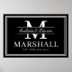Poster moderne minimaliste personnalisé de taille moyenne en noir et blanc avec les prénoms des couples dans un script de calligraphie au-dessus du monogramme du nom de famille, nom complet et date mariage disponible en modèle personnalisable. Un cadeau élégant pour mariés ou une nouvelle maison présent pour la mariée et le marié avec une touche personnelle personnalisée.