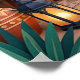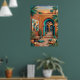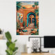 Coucher de soleil dans la cour avec des arches turquoise, des murs en terre cuite, des palmiers, de l'art mural géométrique, des lanternes, des plantes de cactus, des coussins tissés et des tapis à motifs. Ambiance exotique et bohème sous la lueur orange du coucher de soleil. Parfait pour le salon, la chambre à coucher, la décoration globale - impression d'art numérique haute résolution.
