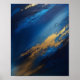 Il s'agit d'un tableau numérique abstrait qui présente des touches texturales et audacieuses dans une palette frappante de bleus profonds, de cobalt et d'indigo, qui contraste de façon spectaculaire avec des accents d'or métallique brillants. La composition utilise de fortes lignes diagonales pour créer un sentiment de mouvement et d'énergie, évoquant l'imagerie d'une vague rapide et luxueuse, une douche météorologique, ou la profondeur profonde d'un ciel nocturne. Les textures contrastées - bleu lisse, blond mélangé et or fortement impasto - ajoutent un intérêt et une sophistication dynamiques à cette pièce contemporaine.