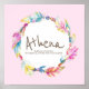 Affiche de nom d'art parfaite pour la chambre ou la salle de jeux d'une fille dans des nuances de rose, de turquoise et de jaune doré marron. Personnalisez avec votre propre nom et la signification de votre nom pour un touche véritablement personnalisée dans la chambre ou la nurserie de votre enfant, cet exemple est pour le nom Athena Déesse de la sagesse Courageuse, astucieuse et intelligente. Impression d'affiche mignonne idéale pour un nouveau-né ou un baptême ou un cadeau d'anniversaire pour fille. © Perles aquarelles uniques et art et design de plumes par Sarah Trett. www.sarahtrett.com pour www.mylittleeden.com