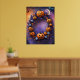 Ajoutez une touche de magie à votre décor d'Halloween avec cette affiche enchanteresse. Doté d'une belle couronne de branches violettes et bleues, ornée de citrouilles orange et bleus, cette oeuvre reflète l'esprit éffrayant et festif d'Halloween. La pleine lune, les chauves-souris volantes et les feuilles d'automne dispersées dans l'arrière - plan rehaussent l'atmosphère étrange, ce qui en fait un complément parfait à vos décorations saisonnières.